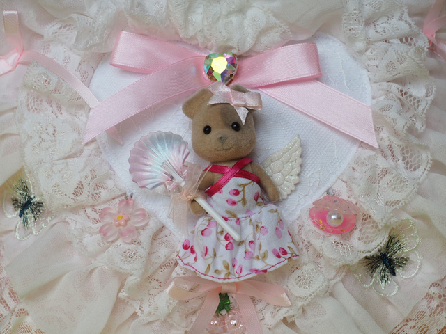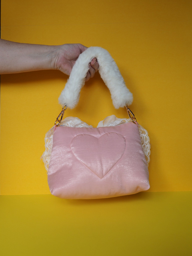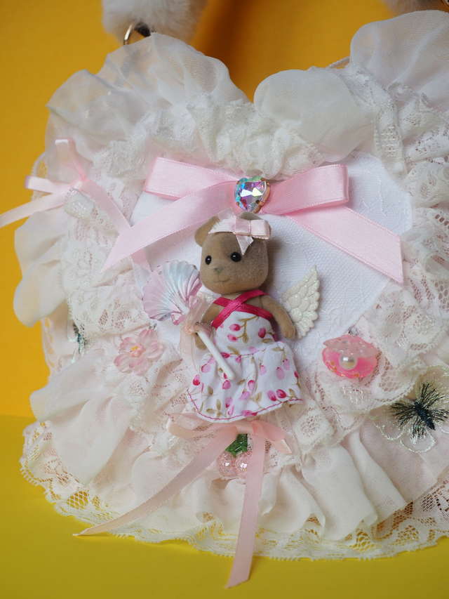 Hand quilted satin with appliquéd lace, charms, bows, glass gems and an up-cycled Sylvanian Family doll toy. Has a fluffy white handle.
