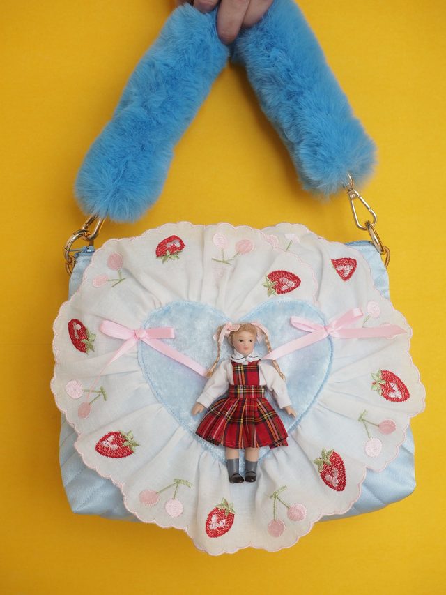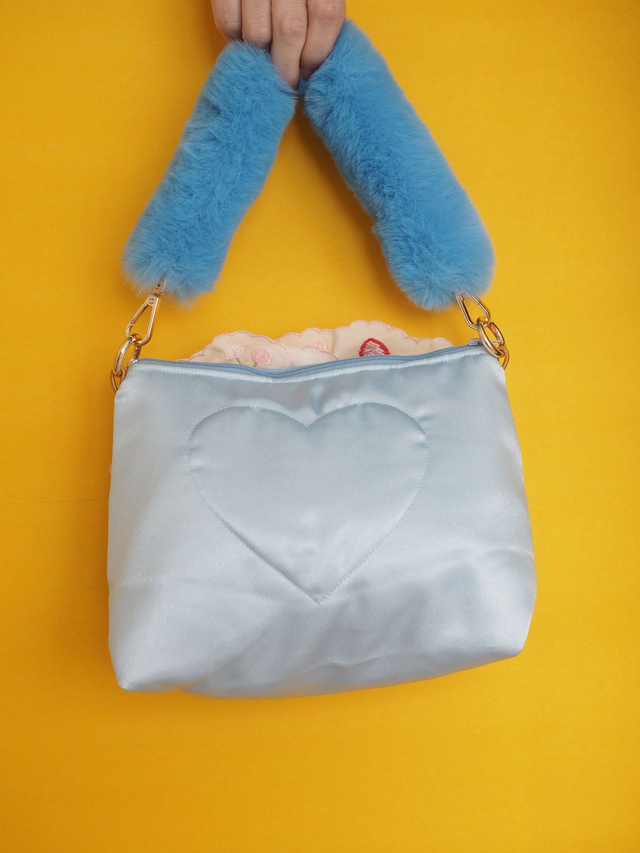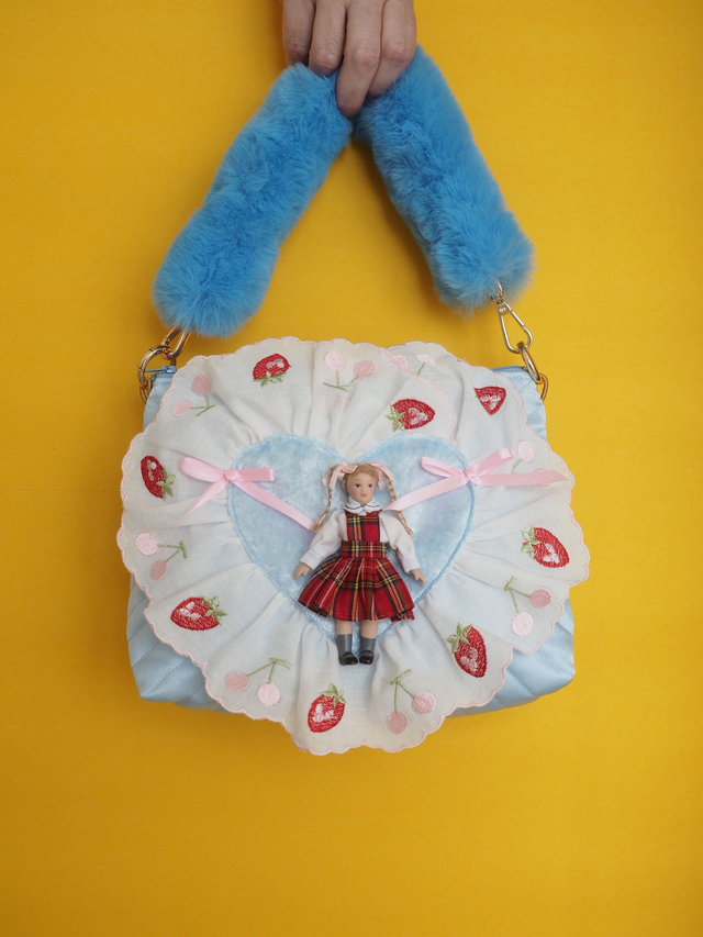 Hand quilted satin with appliquéd up cycled lace and a antique porcelain doll.✨Has a fluffy baby blue handle.