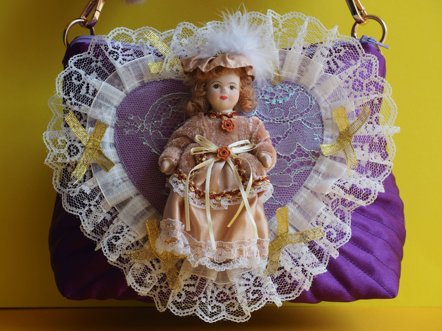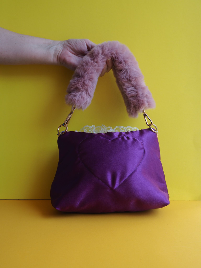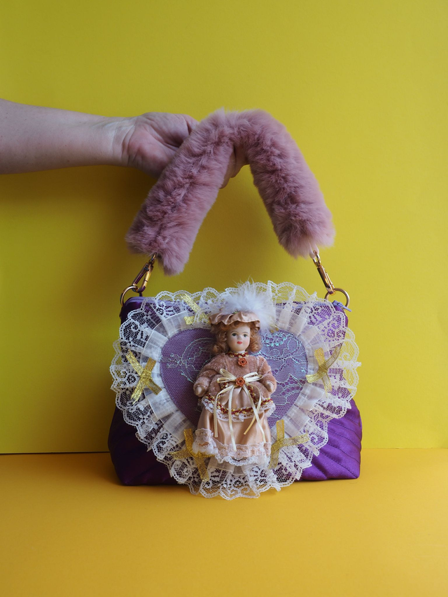 Hand quilted satin with appliquéd up cycled lace and a porcelain doll toy. Has a fluffy dusty pink handle, and a zip opening.