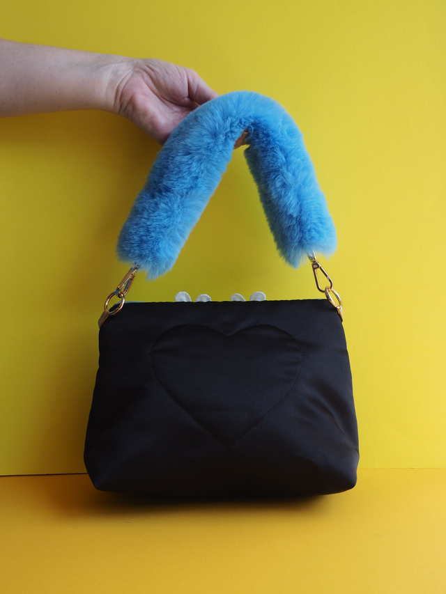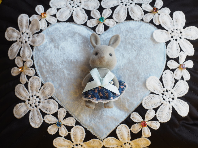Hand quilted satin with appliquéd up cycled lace and a Sylvanian Family doll toy. Has a fluffy blue handle.