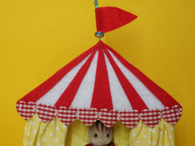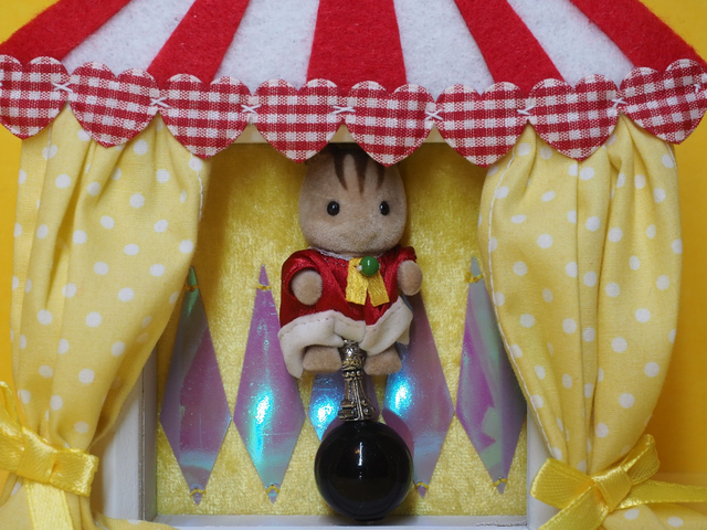 Handmade embroidered felt scenery using up cycled Sylvanian Family doll, in a wooden 9x9cm shadow box frame. Suitable to be displayed on a shelf or hung on a wall.