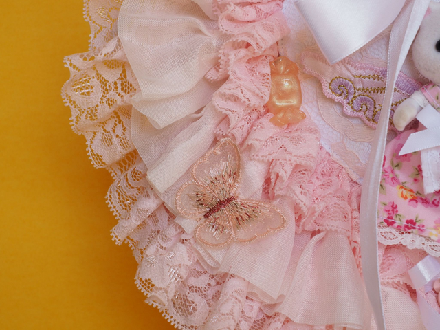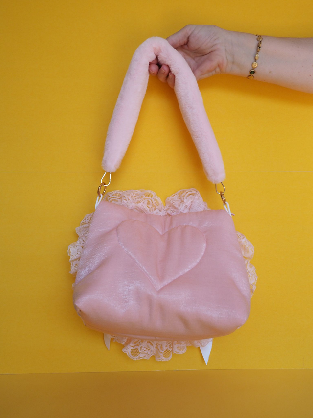 This one-of-a-kind hand-quilted satin purse is a true masterpiece. All our works are 100% handmade and fully original. This purse features exquisite appliquéd lace, adorable charms, bows, glass gems, and even an up-cycled Sylvanian Family doll toy. It also comes with a fluffy lilac handle to add that extra touch of glamour. With dimensions of 18cm in height, 23cm in the widest part, and 11.5cm in depth, it’s the perfect size to hold all your essentials. The handle measures 53cm total, allowing for comfortable carrying. Get ready to turn heads with this stunning piece.