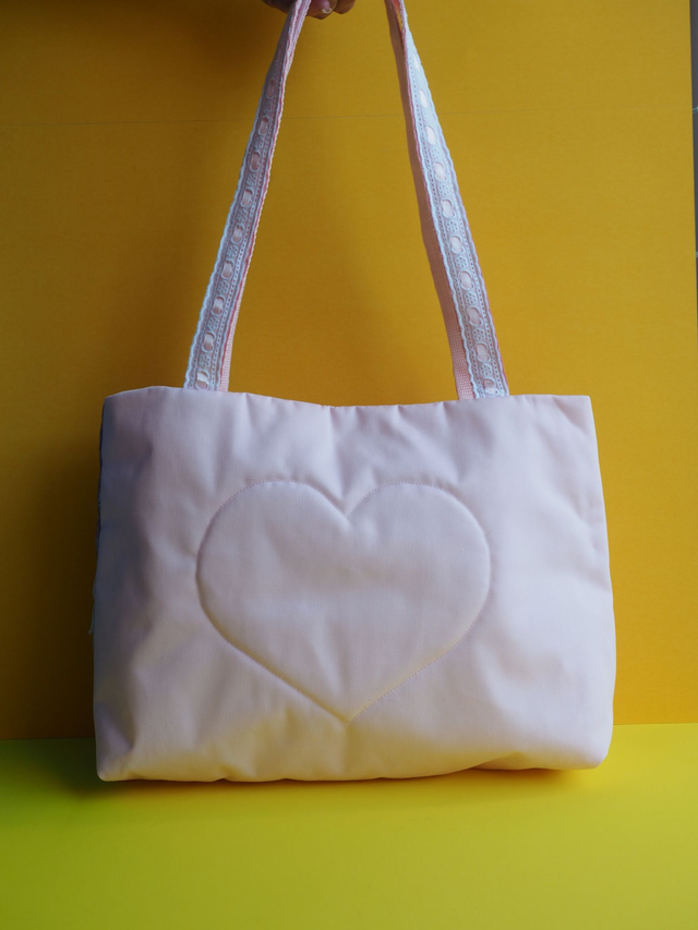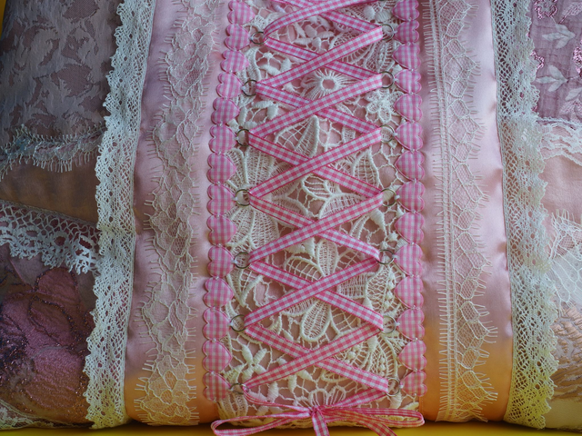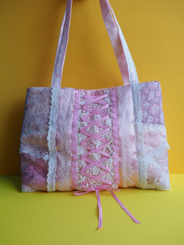 A hand quilted pink handbag with pastel rainbow and lace handles. On the front are up-cycled floral brocade fabrics. A ribbon lace up in the middle to represent the 'Bridgerton' corset look.
