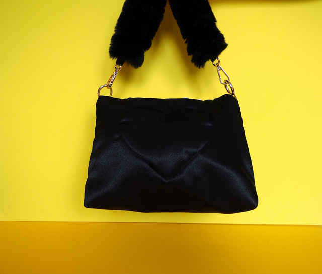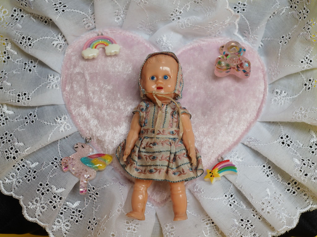 Hand quilted satin with appliquéd up cycled lace and a vintage doll toy. Has a fluffy black handle.