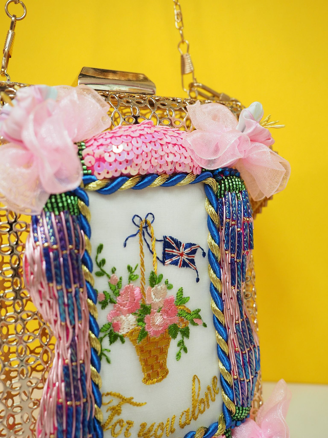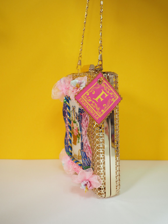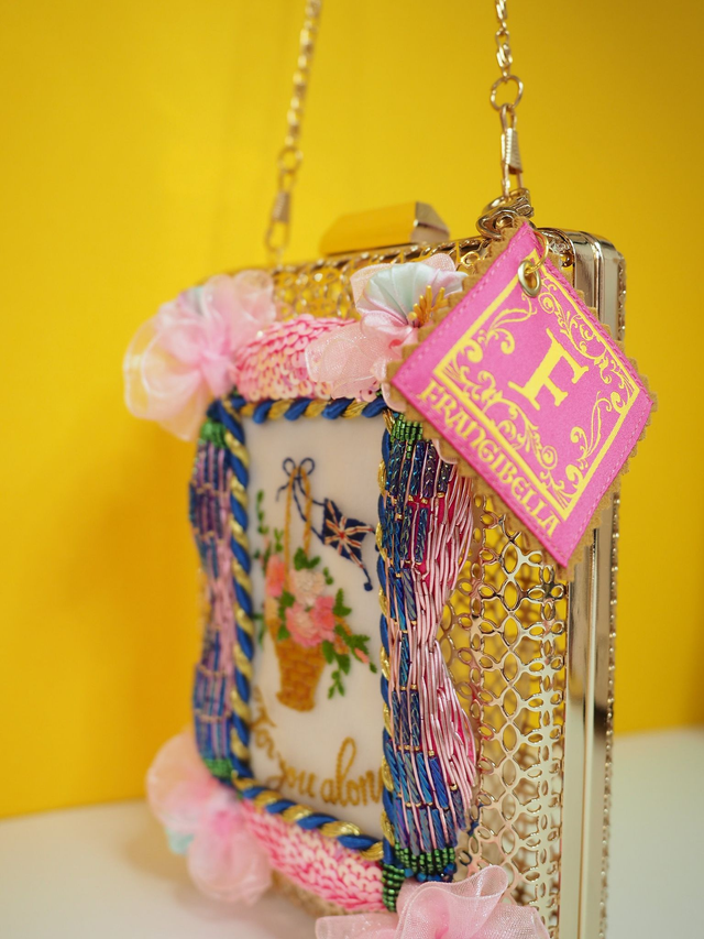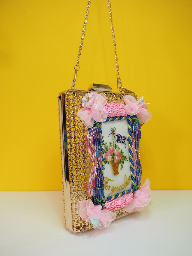 Gold open wire with a hand embroidered frame using Goldwork, gems and beading, and within the frame is an up cycled hand embroidered silk postcard from WWI, entitled “For You Alone” with flowers in embroidery on the front. A label with gold PVU leather keychain on the side for decor. Comes with a crossbody/shoulder strap chain.