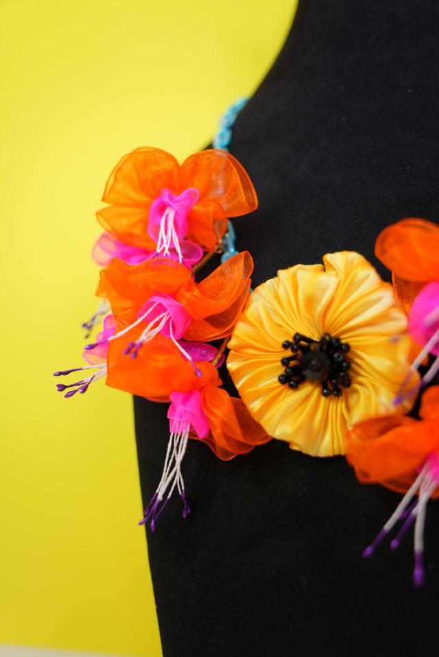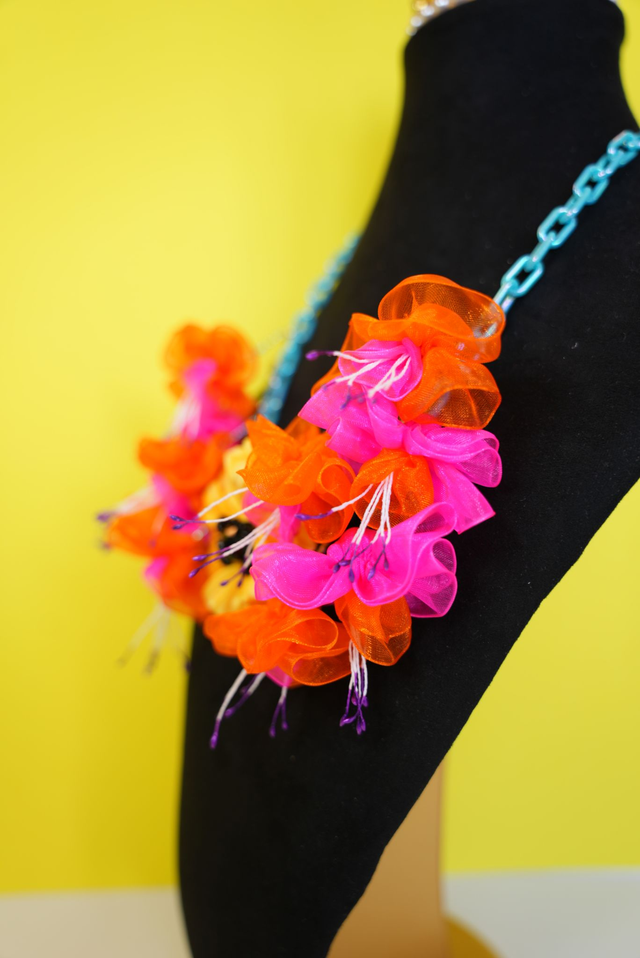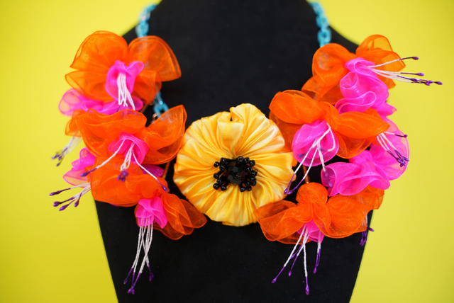 Handmade flowers using ribbon and Shibori Silk with hand embroidery. Magnetic clasp on a lightweight acrylic chain.