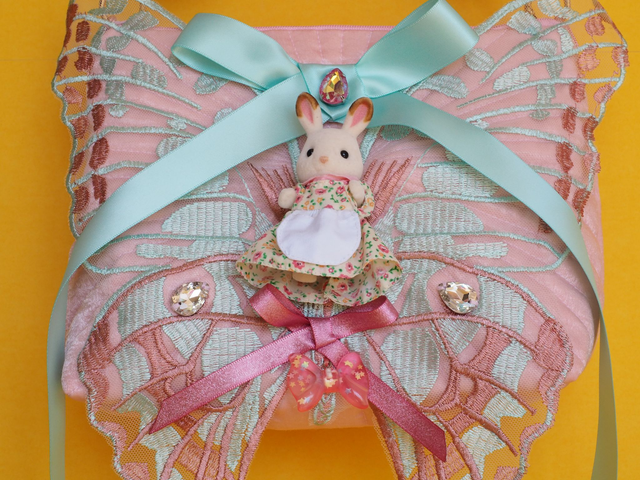 Hand quilted satin with appliquéd up cycled lace and a Sylvanian Family doll toy. Has a fluffy pink handle.