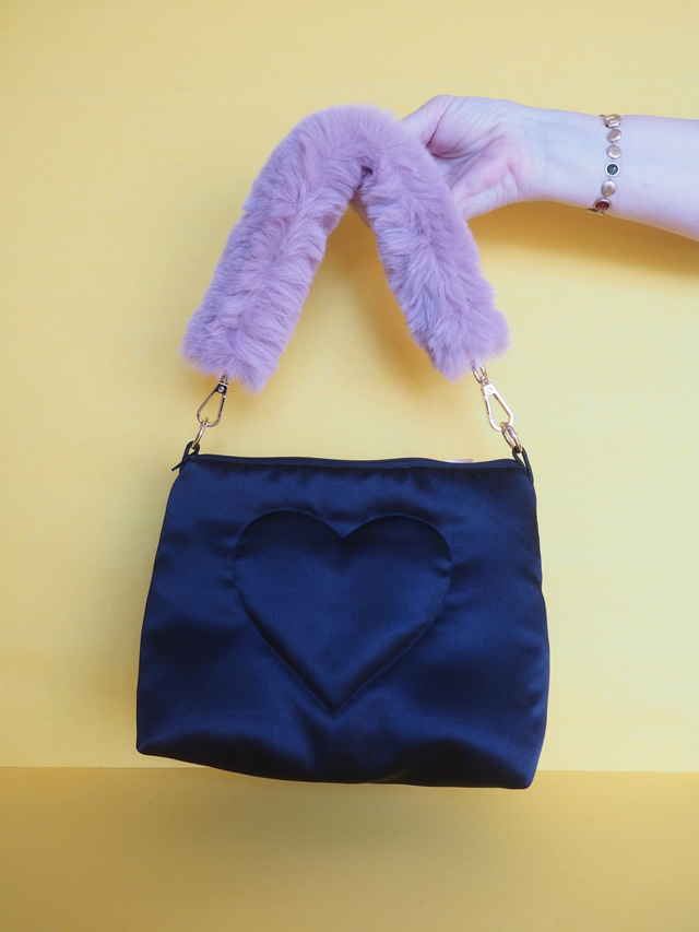 Hand quilted satin with appliquéd up cycled lace and a Sylvanian Family doll toy. Has a fluffy handle.