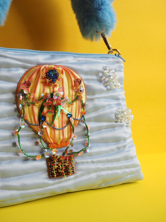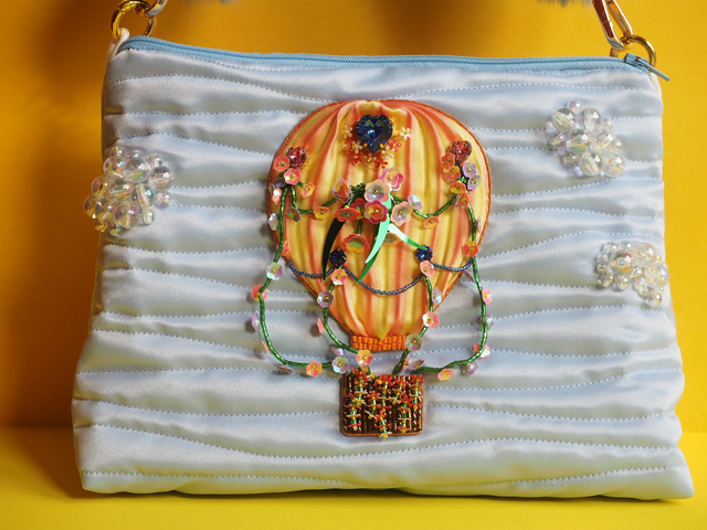 Hand quilted satin with appliquéd Japanese Shibori Silk and Swarovski Heart crystals and 3D beaded embroidery in the shape of a Hot air balloon. Has a fluffy baby blue handle.