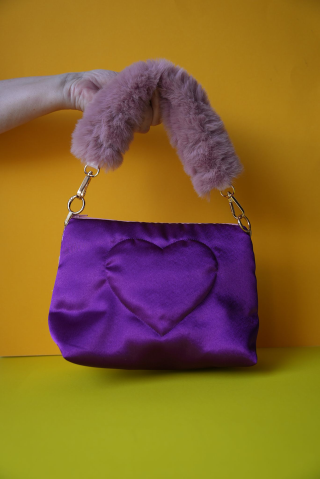 Hand quilted satin with up cycled lace and brocade fabrics. Has a dusty pink fluffy handle. This bag is part of the Bridgerton Bag Collection.
