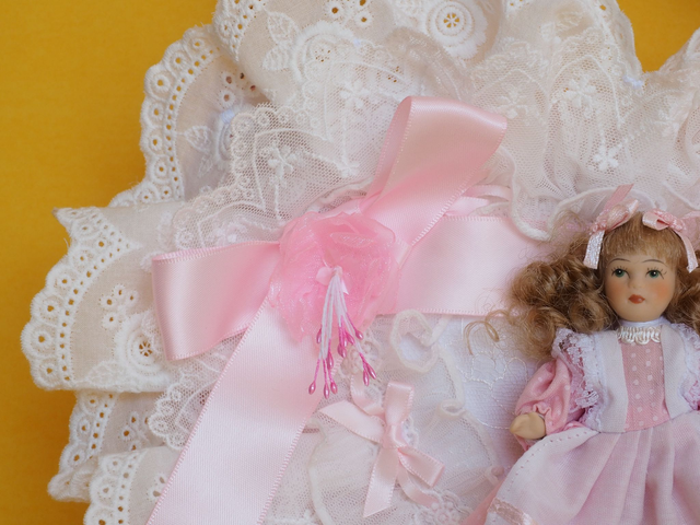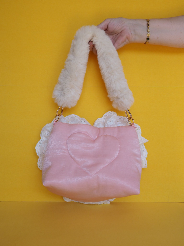 This exquisite piece is truly one-of-a-kind. Hand-crafted with a meticulous attention to detail, it boasts a gorgeous hand-quilted satin design that is accentuated by charming appliquéd lace, bows, glass gems, and an upcycled vintage porcelain doll toy. With a fluffy cream handle that exudes sophistication and elegance, this item is perfect for any stylish woman looking for a standout piece. Measuring 18cm in height and 23cm in width at its widest point, this accessory is compact yet spacious, with a depth of 11.5cm. The handle is also comfortably long, at 54cm total. All our products are 100% handmade and original, making them special and unique.