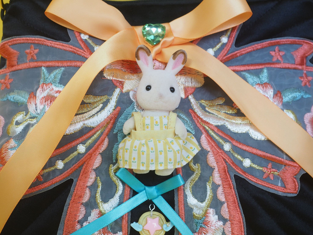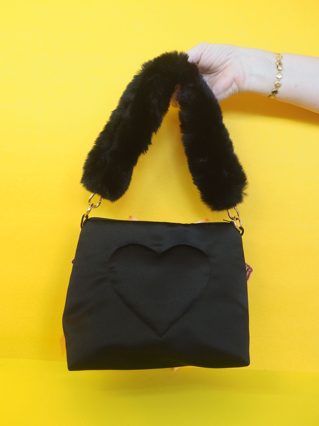 Hand quilted satin with appliquéd embroiderd butterfly and an up cycled Sylvanian Family doll toy. Has a fluffy black handle.
