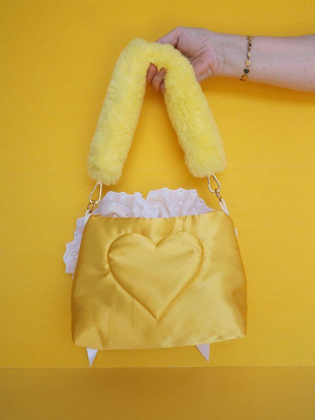 Introducing a truly unique piece that showcases the artist's originality and handiwork. This hand quilted satin bag features delicate lace appliqué, charming bows, glass gems, and even an up-cycled Sylvanian Family toy for a whimsical touch. The vibrant yellow handle adds a fun accent to this one-of-a-kind creation. Dimensions are 18cm in height, 23cm at the widest part, and 11.5cm in depth with a total handle length of 54cm. Perfect for adding a touch of personality to any outfit, this bag is made with love and is 100% handmade.