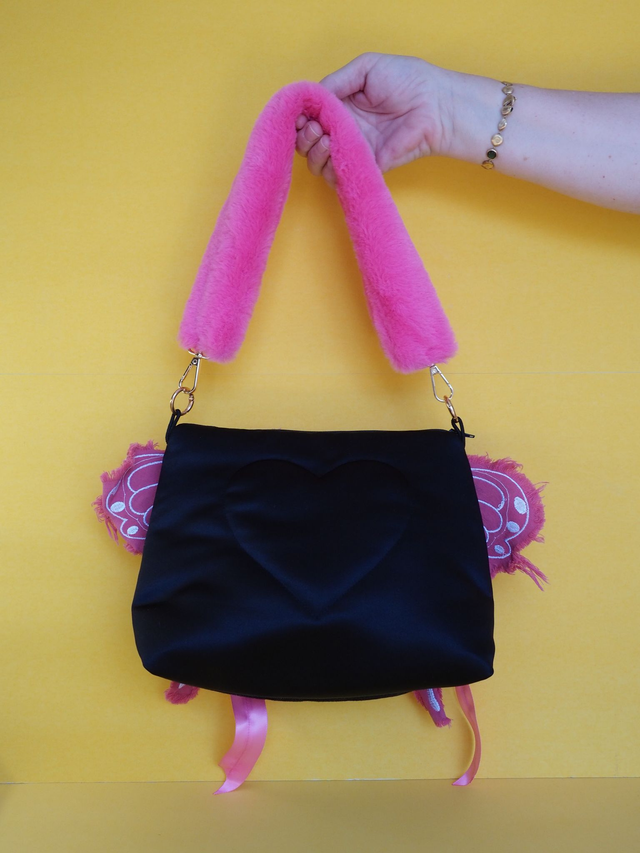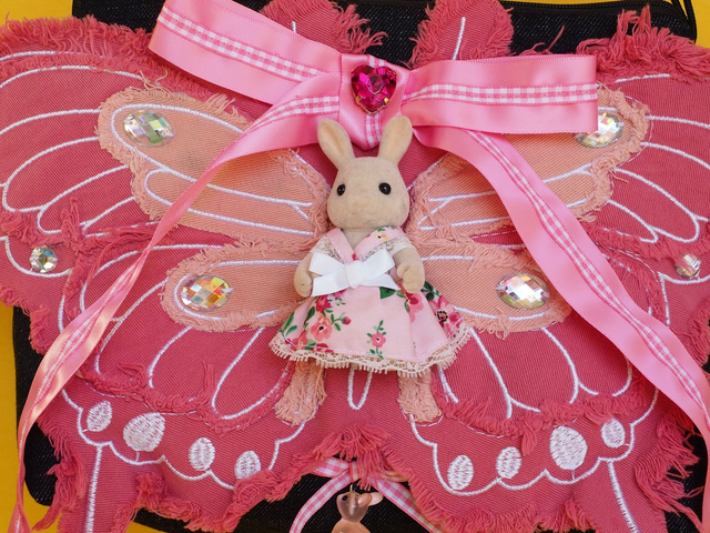 Hand quilted satin with appliquéd denim butterfly, embroidered gems and an up-cycled Sylvanian Family doll toy. Has a fluffy pink handle.