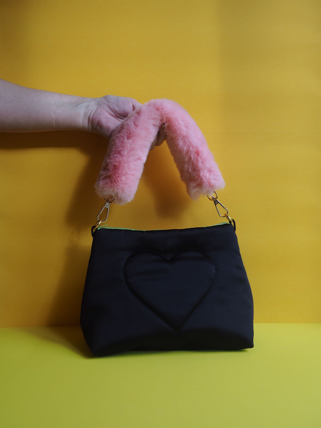 Hand quilted satin with handmade poppy flowers made from Japanese Shibori Silk. Has a fluffy pink handle.