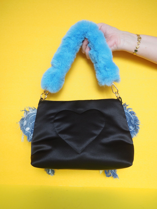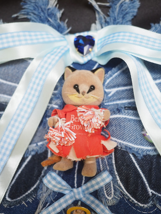 Hand quilted satin with appliquéd denim butterfly, embroidered gems and an up-cycled rare cheerleader Sylvanian Family doll toy. Has a fluffy blue handle.
