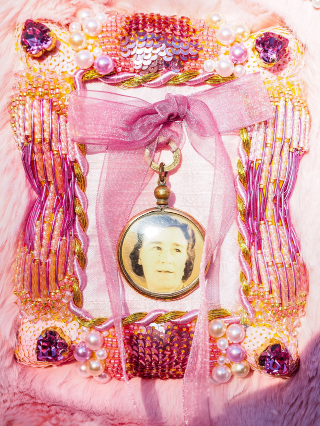 A pink faux fur handbag with faux pearl handles and a hot pink lining. On the front is a hand embroidered frame using Goldwork embroidery, Swarovski crystals and beading, and within the frame is an antique picture frame of a couple on either side and a pink ribbon bow above the couple picture frame. The photos are removable to place your own. Around the embroidered frame are pink-leathered hearts with sweet sayings written in hand embroidered pearls, resembling heart candies.
