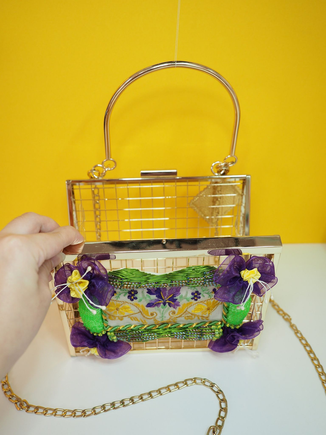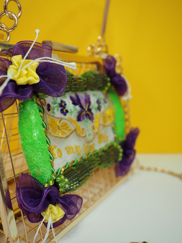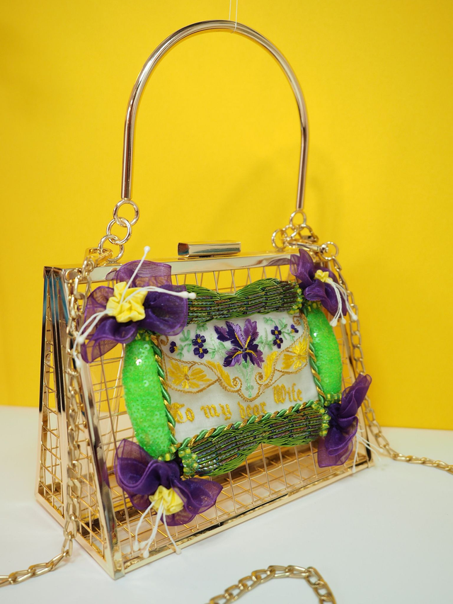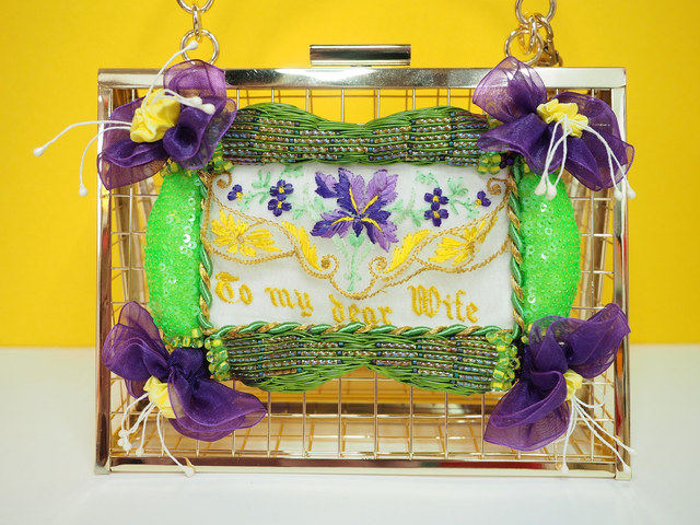 Gold open wire with a hand embroidered frame using Goldwork, gems and beading, and within the frame is an up cycled hand embroidered silk postcard from WWI, entitled “To My Dear Wife” with flowers in embroidery on the front. A label with gold PVU leather keychain on the side for decor. Comes with a crossbody/shoulder strap chain.