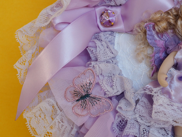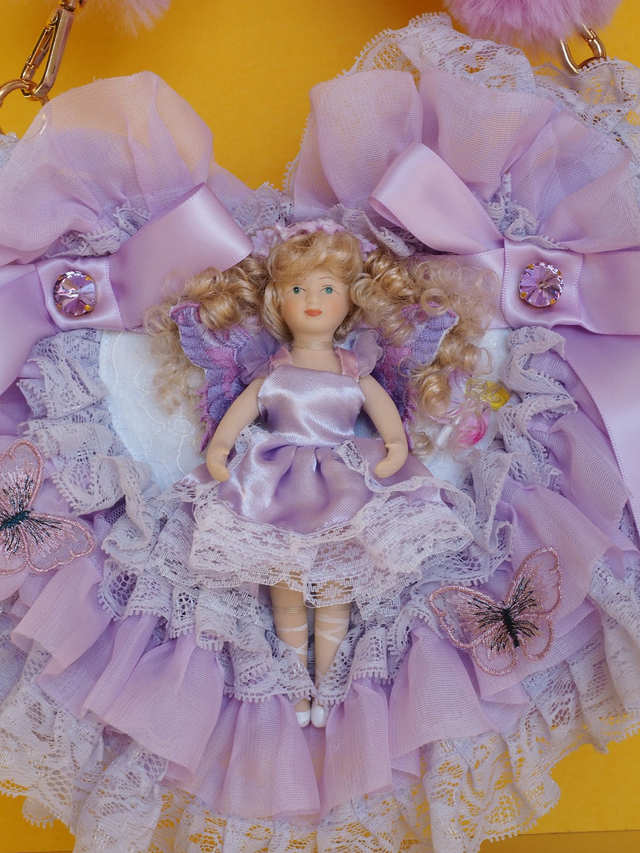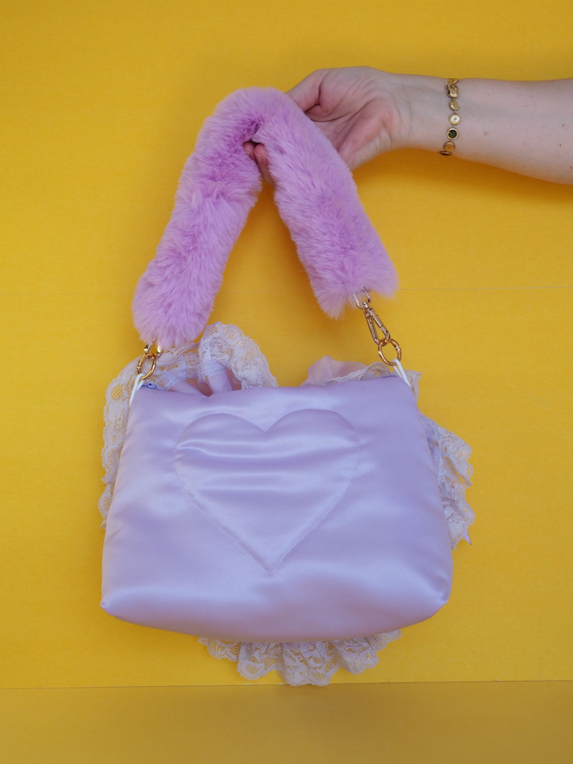 This one-of-a-kind hand-quilted satin purse is a true masterpiece. All our works are 100% handmade and fully original. This purse features exquisite appliquéd lace, adorable charms, bows, glass gems, and even an up-cycled Sylvanian Family doll toy. It also comes with a fluffy lilac handle to add that extra touch of glamour. With dimensions of 18cm in height, 23cm in the widest part, and 11.5cm in depth, it’s the perfect size to hold all your essentials. The handle measures 47cm total, allowing for comfortable carrying. Get ready to turn heads with this stunning piece.