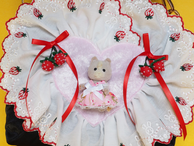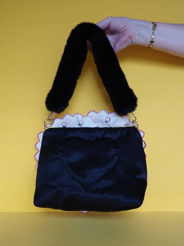 Introducing a one-of-a-kind hand-quilted satin bag, complete with appliquéd upcycled lace and a charming Sylvanian Family doll toy. Adorned with a beautifully crafted handmade strawberry and accented with a fluffy baby pink handle, this bag is a true masterpiece. Each of our creations is 100% original and handmade with care, ensuring that you receive a unique and special product. Measuring 18cm in height, 23cm at its widest point, and with a depth of 11.5cm, this bag is perfect for carrying all your essentials in style. With a handle length of 51cm overall, this bag is versatile and practical for a variety of occasions.
